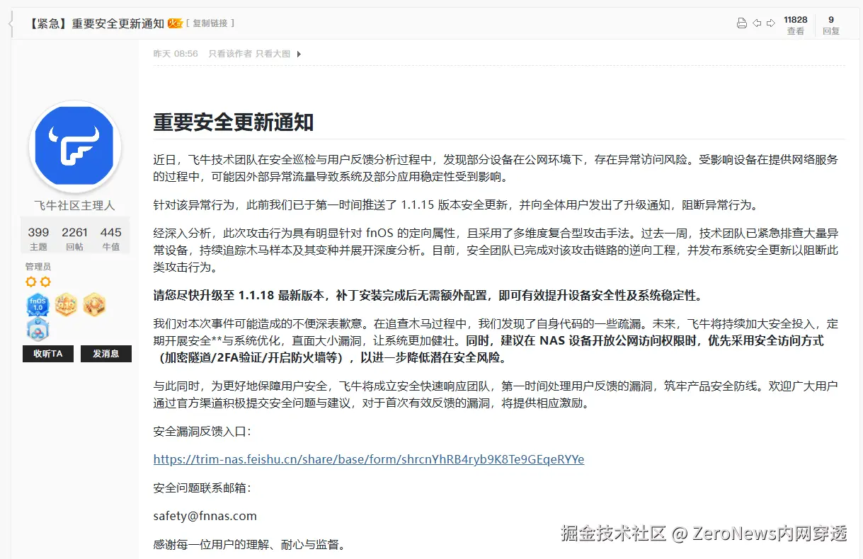 我们关注到合作伙伴飞牛(fnOS)于昨日(2026年2月1日)正式发布了【紧急】重要安全更新通知。作为其应用市场的上架服务商,ZeroNews一直密切留意此事的进展,并对官方及时、透明的回应表示支持。