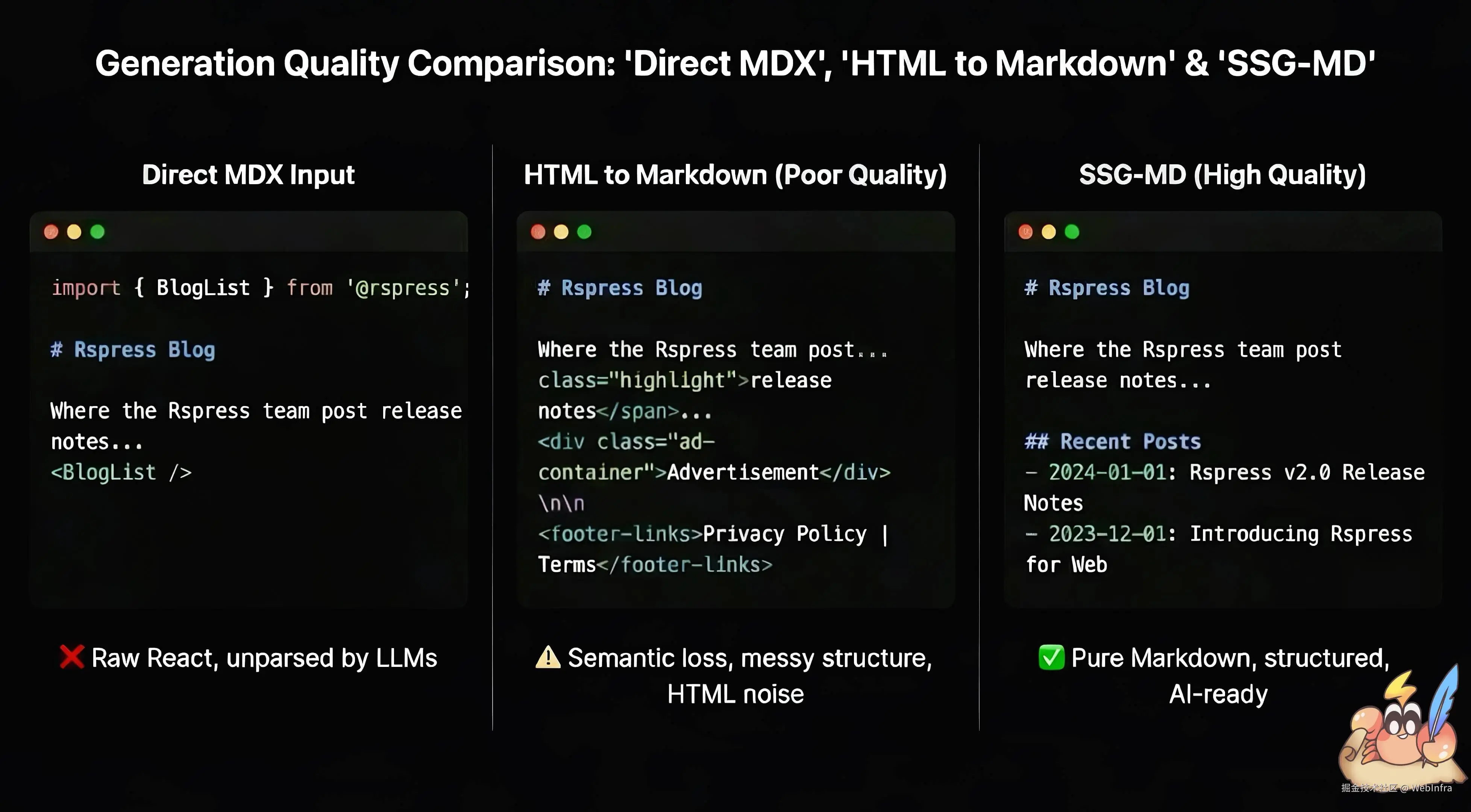 - 直接将 MDX 输入给 AI 会包含大量代码语法噪音,并丢失 React 组件内容