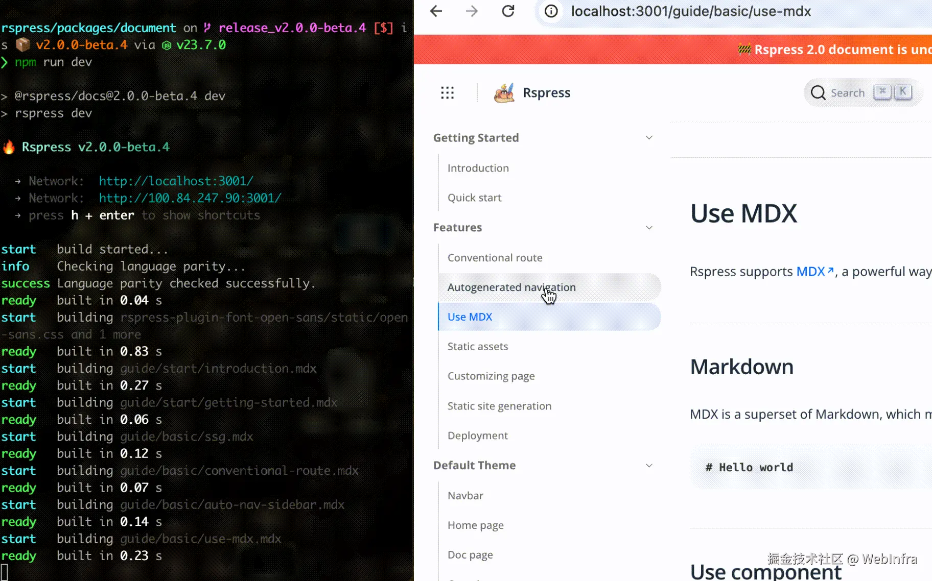Rspress 2.0 底层由 Rsbuild 和 Rspack 2.0 预览版本驱动,同时默认开启了 按需编译 和 持久化缓存。