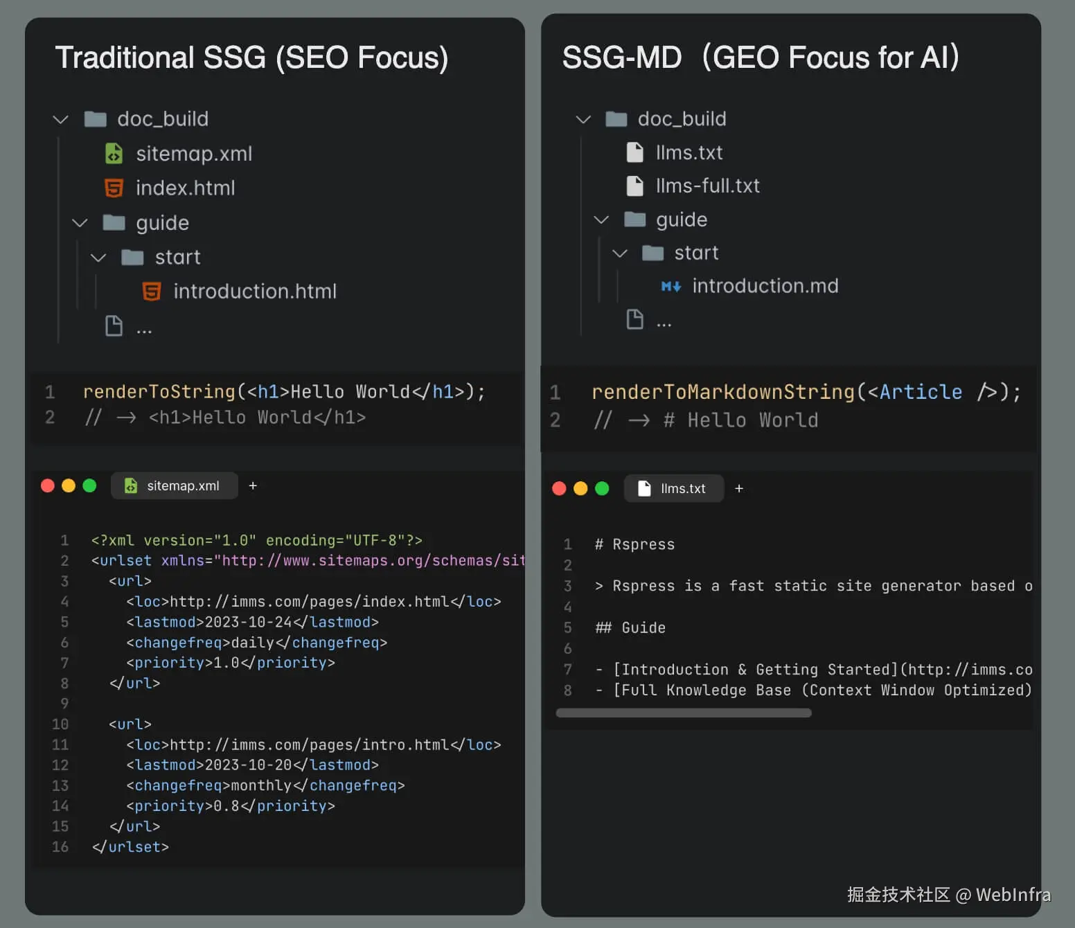 为了解决这个问题,Rspress 2.0 引入了 SSG-MD 特性。这是一个全新的功能,它类似于 静态站点生成(SSG),但不同之处在于它将你的页面渲染为 Markdown 文件,而非 HTML 文件,并生成 llms.txt 及 llms-full.txt 相关文件。