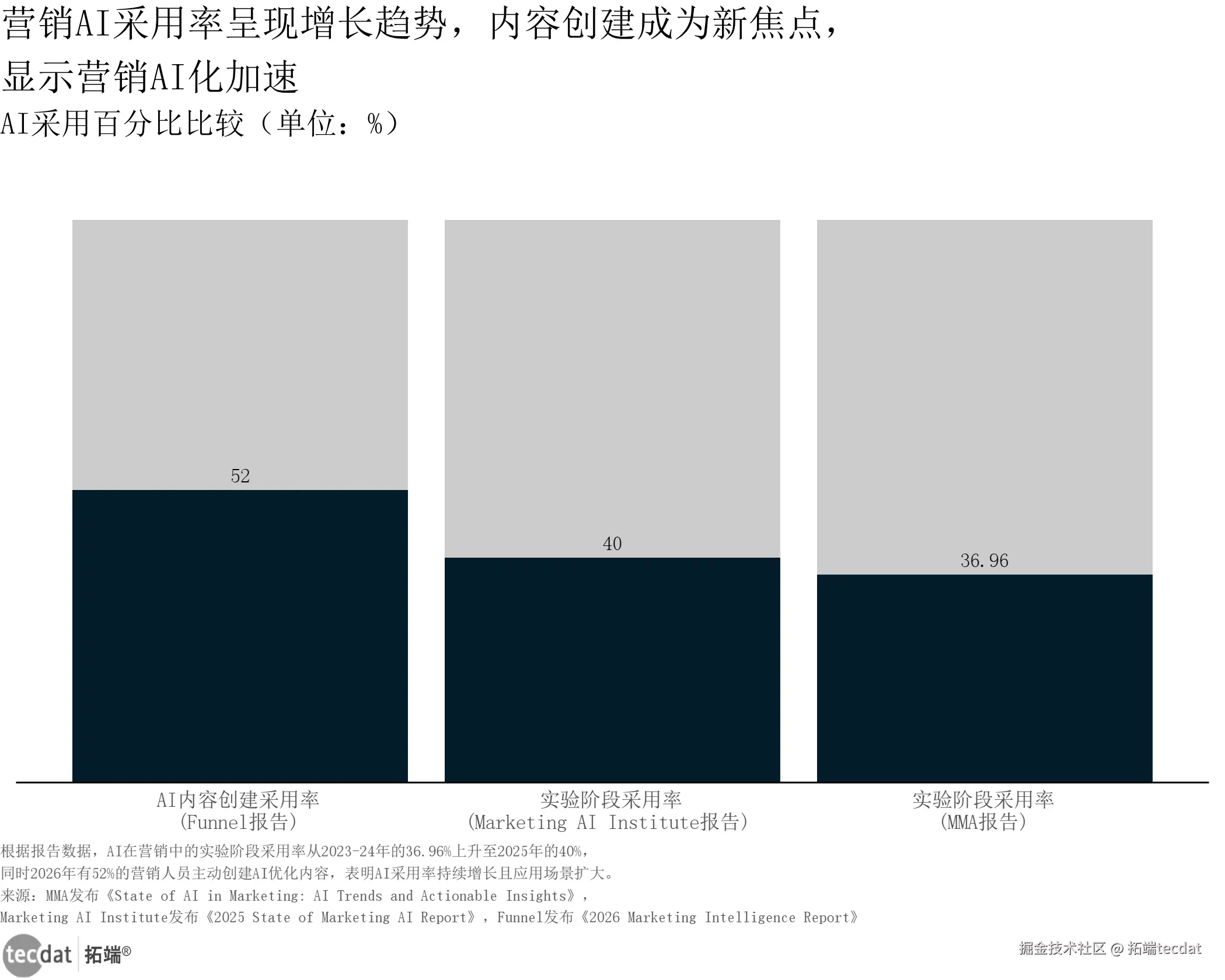 核心数据:MMA报告显示2023-24年AI营销实验阶段采用率为36.96%,Marketing AI Institute 2025年报告显示该比例升至40%,Funnel 2026年报告指出52%的营销人员主动创建AI优化内容。