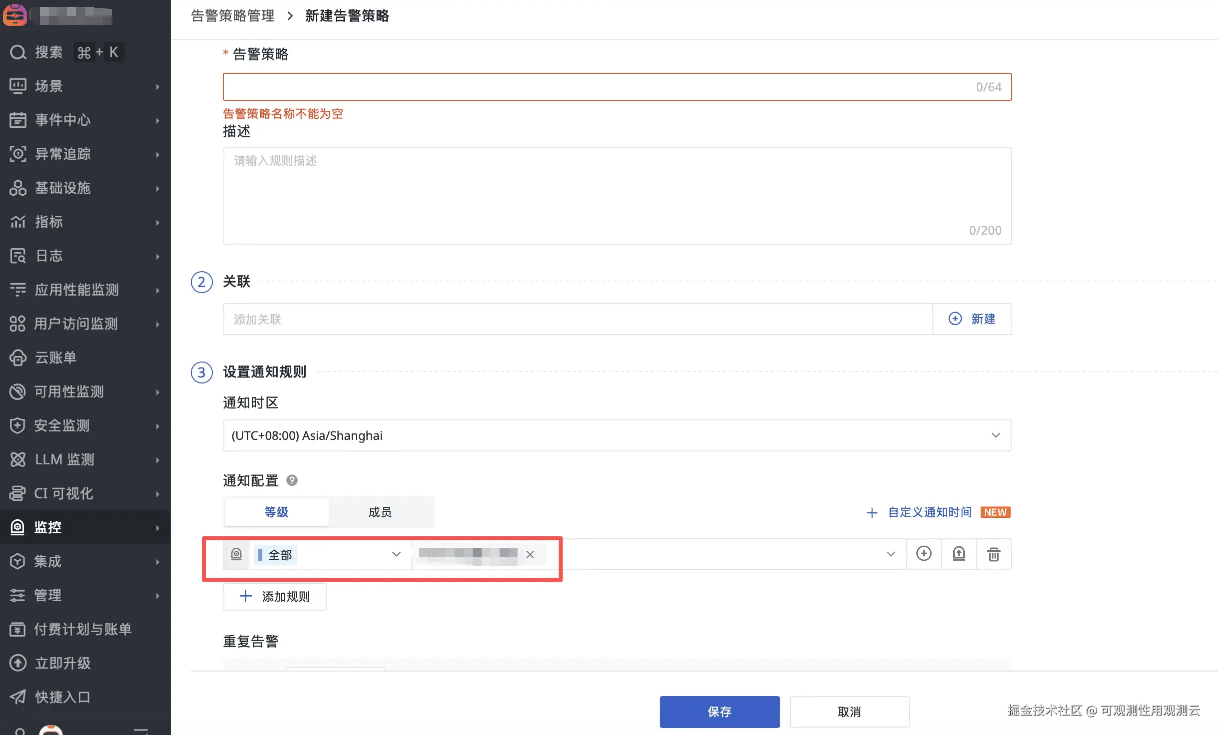 点击「监控」 -「告警策略管理」-「新建告警策略」。通过关联监控器与告警策略,系统可在异常发生时即时向指定对象发送通知。策略支持配置名称、描述、时区与操作权限等基础信息,并允许按告警等级、通知对象两个维度灵活定义通知规则。针对高紧急度场景可启用升级通知机制,同时支持自定义通知发送时段,以适配不同时段的业务需求。