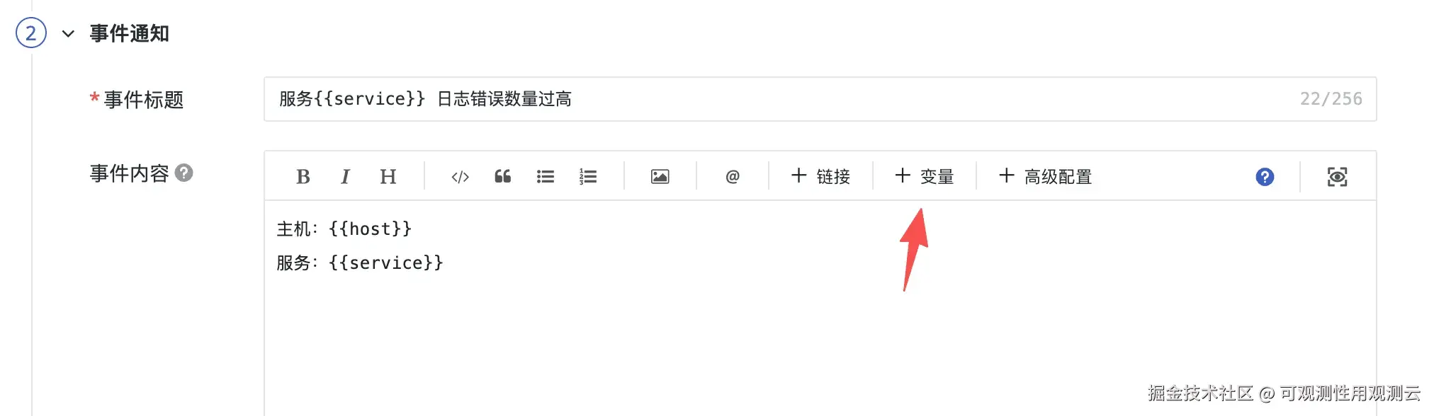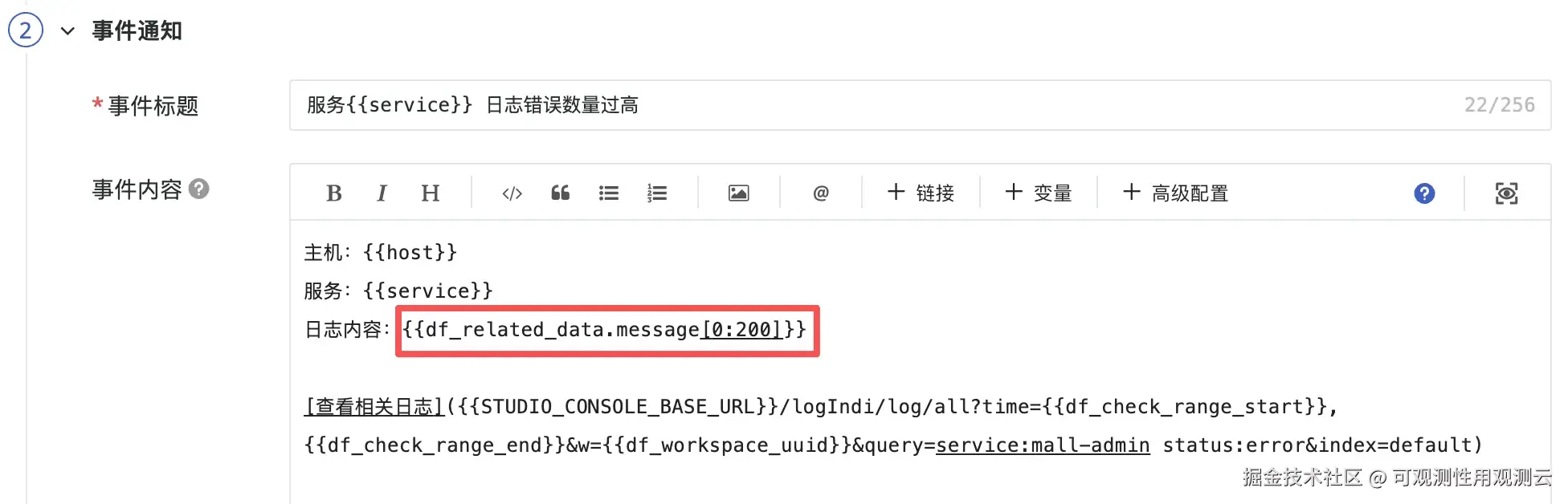 点击“变量”插入 {{df_related_data.message}},建议截取前200字符避免超出告警工具长度限制。