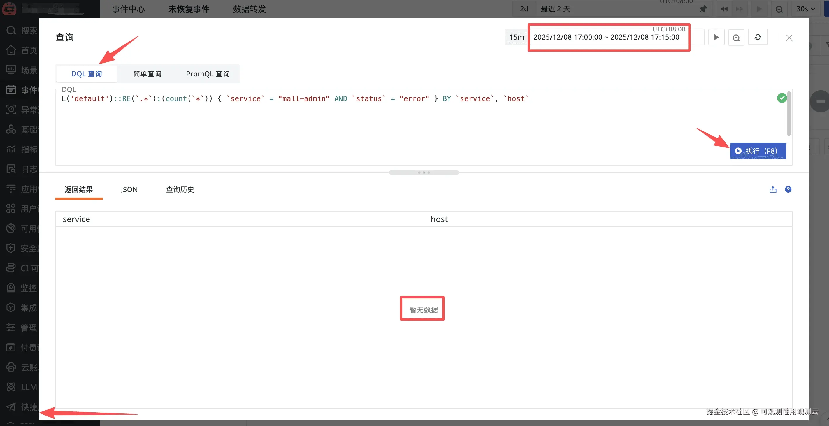 打开「快捷入口」 -「DQL 查询」,粘贴 DQL,去掉外层的 windows 函数,去掉转义,检测区间选择和监控器相同,点击“执行”。如果无数据则不会触发告警。