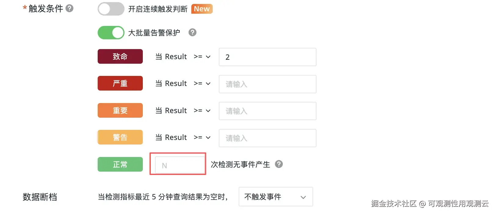 连续两个周期无异常触发恢复事件,留空则不发送。