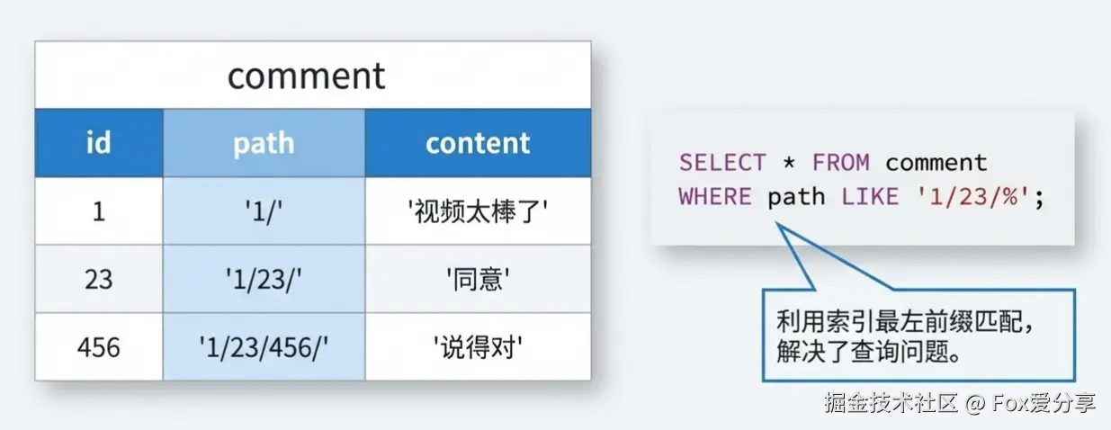 答: 建普通索引。查询用 LIKE '1/23/%'。这走的是最左前缀匹配,索引不会失效,性能是可以的。