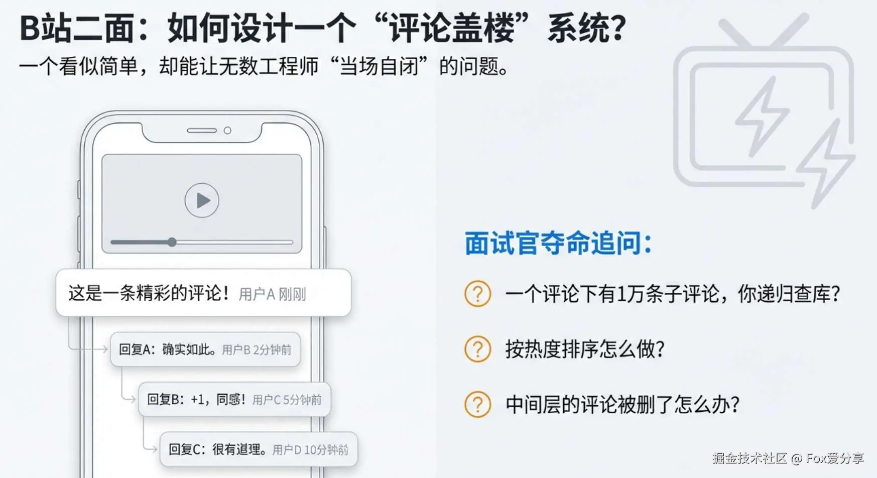 上周有个三年开发经验的粉丝找我哭诉,说去面 B 站,二面挂得莫名其妙。 面试官让他设计一个类似 B 站/抖音的评论系统。他心想:这不就是建张表,存个 parent_id 搞自关联嘛?