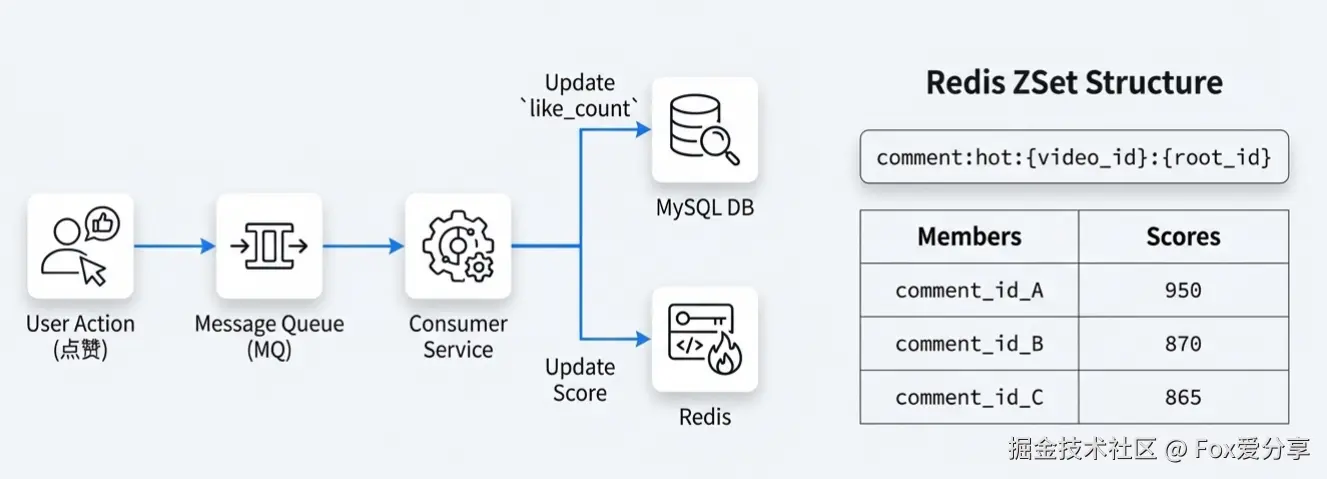 - 用户点赞 -> 异步写入 MQ -> 消费者更新 MySQL -> 同时更新 Redis ZSet 的 Score。