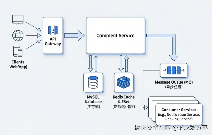 (点赞+回复)计算 Score,实现高性能 TopN 排序。- 高并发优化: 引入 MQ 做削峰。点赞、回复、@通知全部异步化。