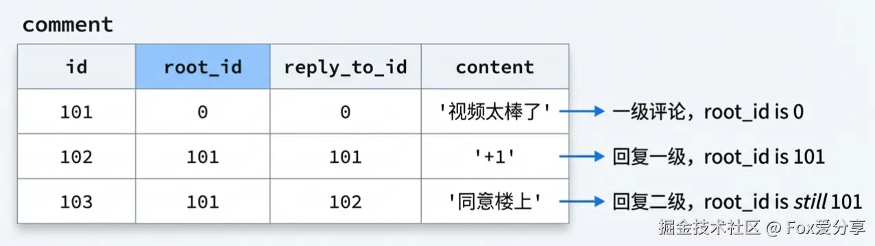 root_id(核心): 永远存储最顶层那个一级评论的 ID。- 如果是 ID 101(一级评论),