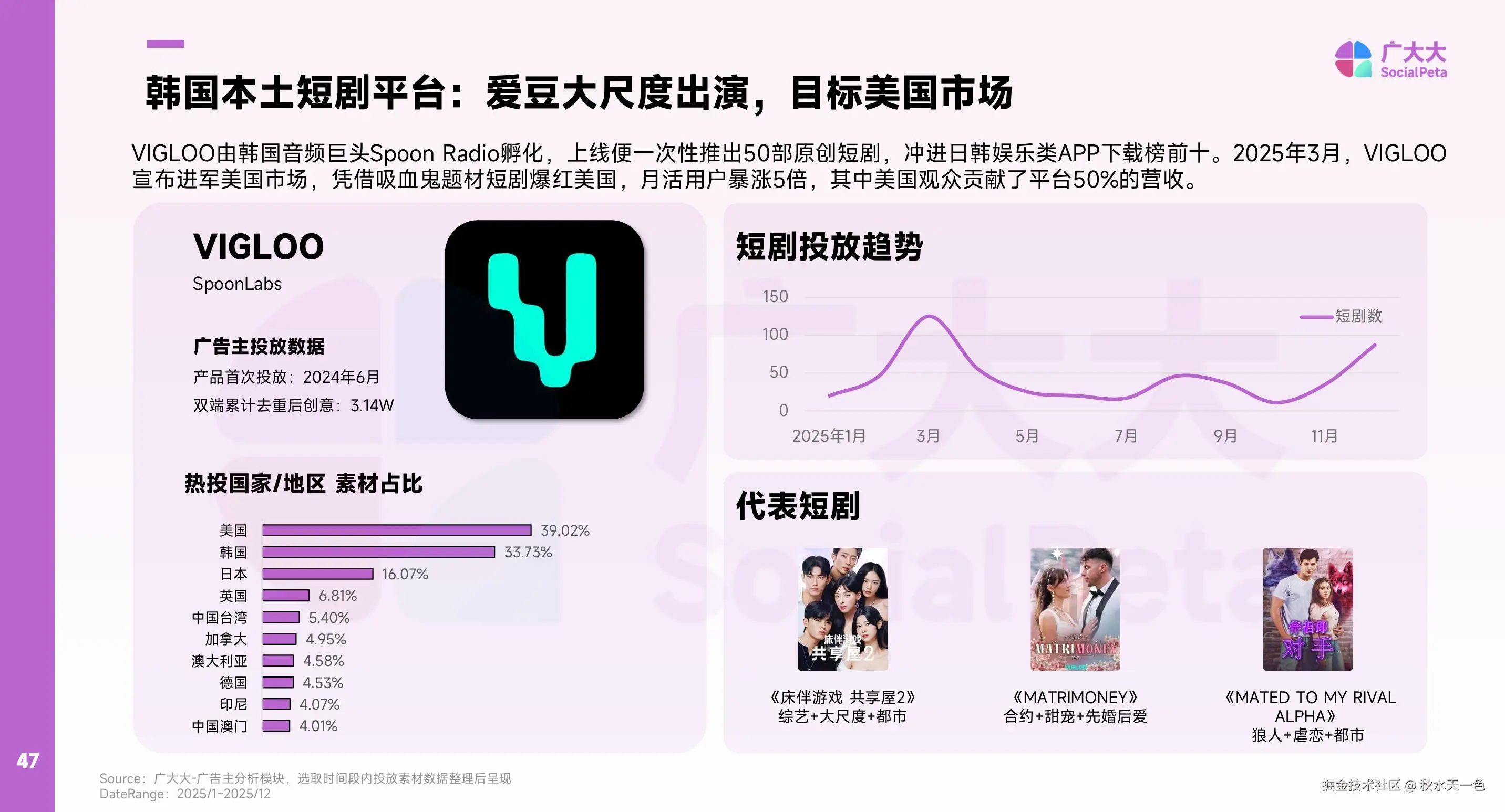 他们不再依赖“中式爽点模板 + 翻译出海”,而是从内容源头、演员结构、叙事方式上,贴近本地文化语境。就以【VIGLOO】为例,出海早期以吸血鬼题材爆红美国,但在发展中期却加入了非常多的韩式标签——大尺度综艺和爱豆面孔,用自身优势去强化文化差异,从而在全球短剧市场中站稳脚跟。这样的趋势也正在对仍高度依赖国内爆款模版的中国短剧团队,形成实质性的压力。