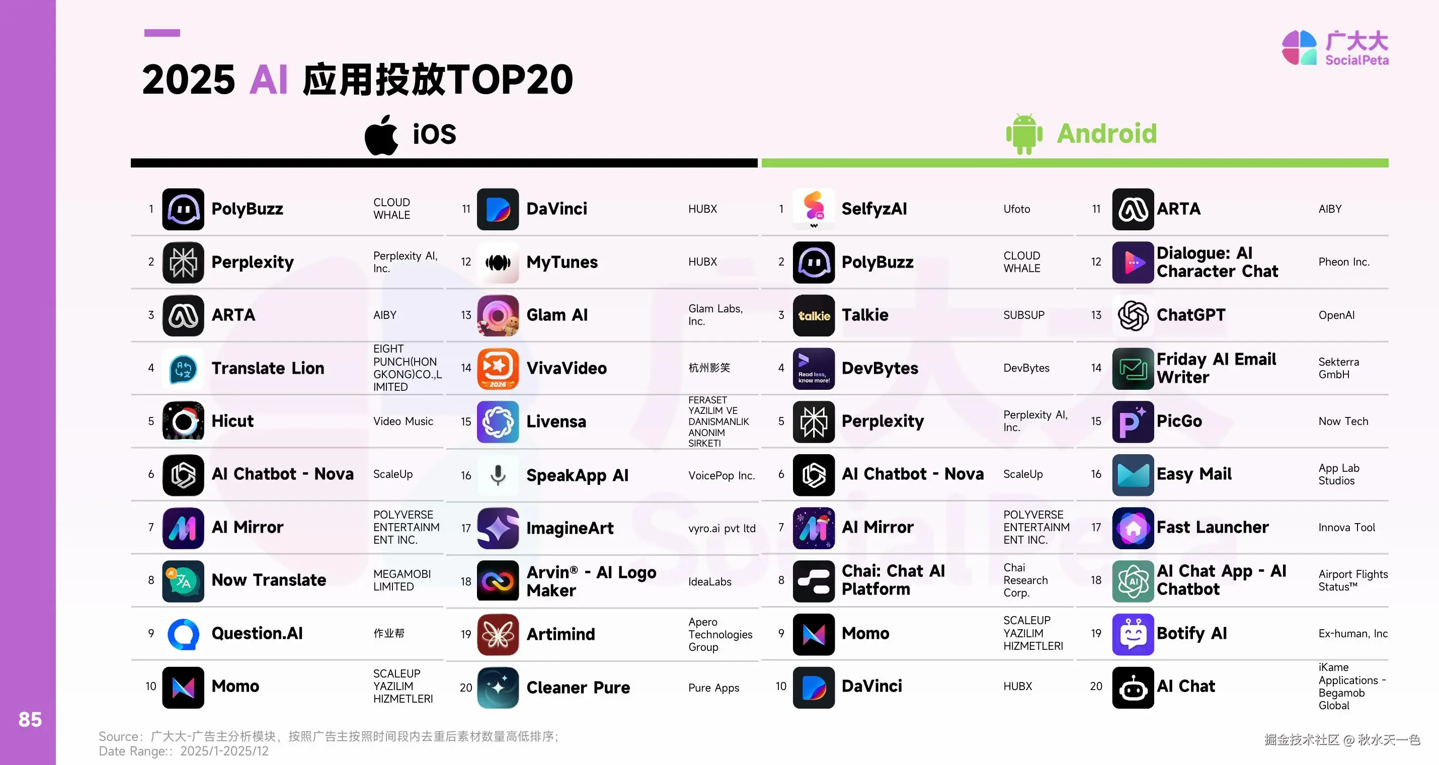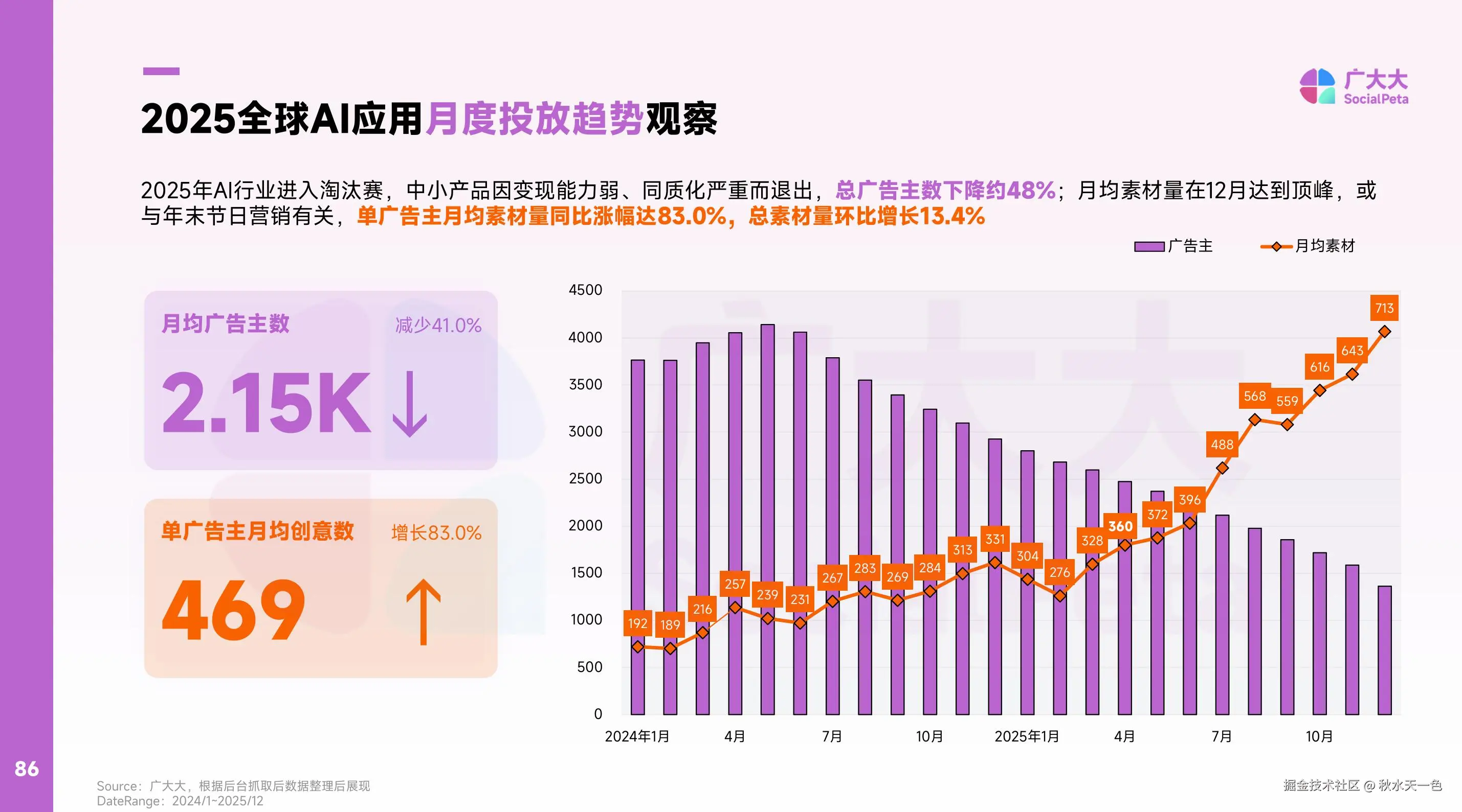 2025年AI行业进入淘汰赛,中小产品因变现能力弱、同质化严重等问题而退出争锋,于是带来的数据表现便是总广告主数下降近半;但头部厂商却仍在发力,试图用更多的素材量来抢占更多市场,随着年末营销节点的到来,月均素材量也在12月达到顶峰。
