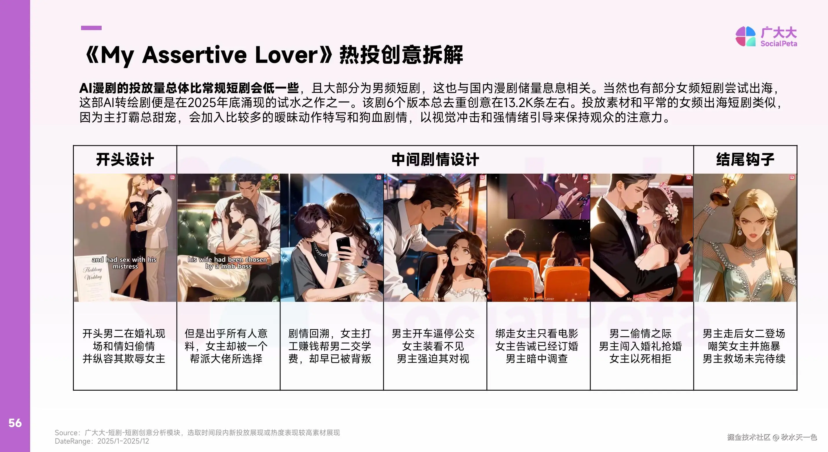 虽然在AI漫剧出海初期是以男频短剧占主力(或与国内爆款储量有关),但随着漫剧出海进程的发展,女频漫剧也开始了投放尝试。与男频AI漫剧不同的是,女频AI漫剧一经出海,便是多版本+海量素材打底,2025年海外投放AI漫剧约895部,全年投放量最高便是下面这部从12月才开始投放的AI转绘女频剧《My Assertive Lover》。