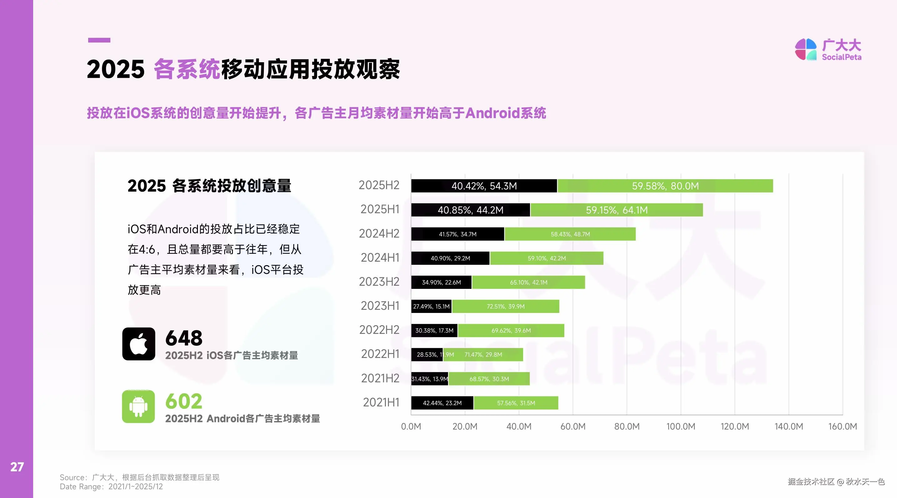另外一个值得注意的变化是系统层面:iOS 与 Android 的投放比例已稳定在4:6,但iOS单广告主平均素材量却明显高于Android,这背后则是高付费市场对精细化内容和高质量创意的更高要求。