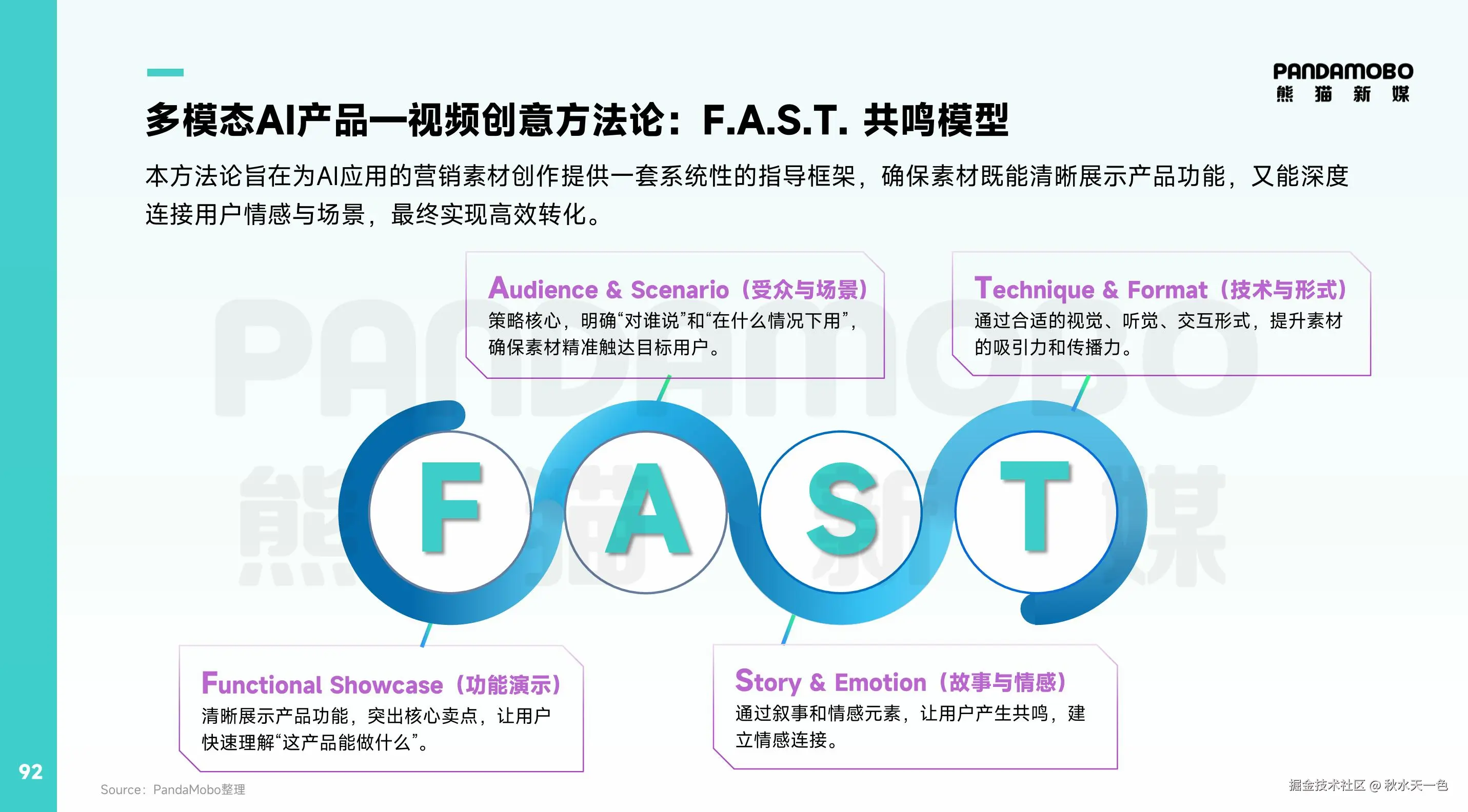 相比“炫技”,长期价值和透明沟通更容易建立用户关系。AI应用营销正在从新鲜感驱动,转向决策价值驱动。关于这点,PandaMobo熊猫新媒也提出了针对性的创意方法论:F.A.S.T. 共鸣模型,旨在为AI应用的营销素材创作提供一套系统性的指导框架,确保素材既能清晰展示产品功能,又能深度连接用户情感与场景,最终实现高效转化。