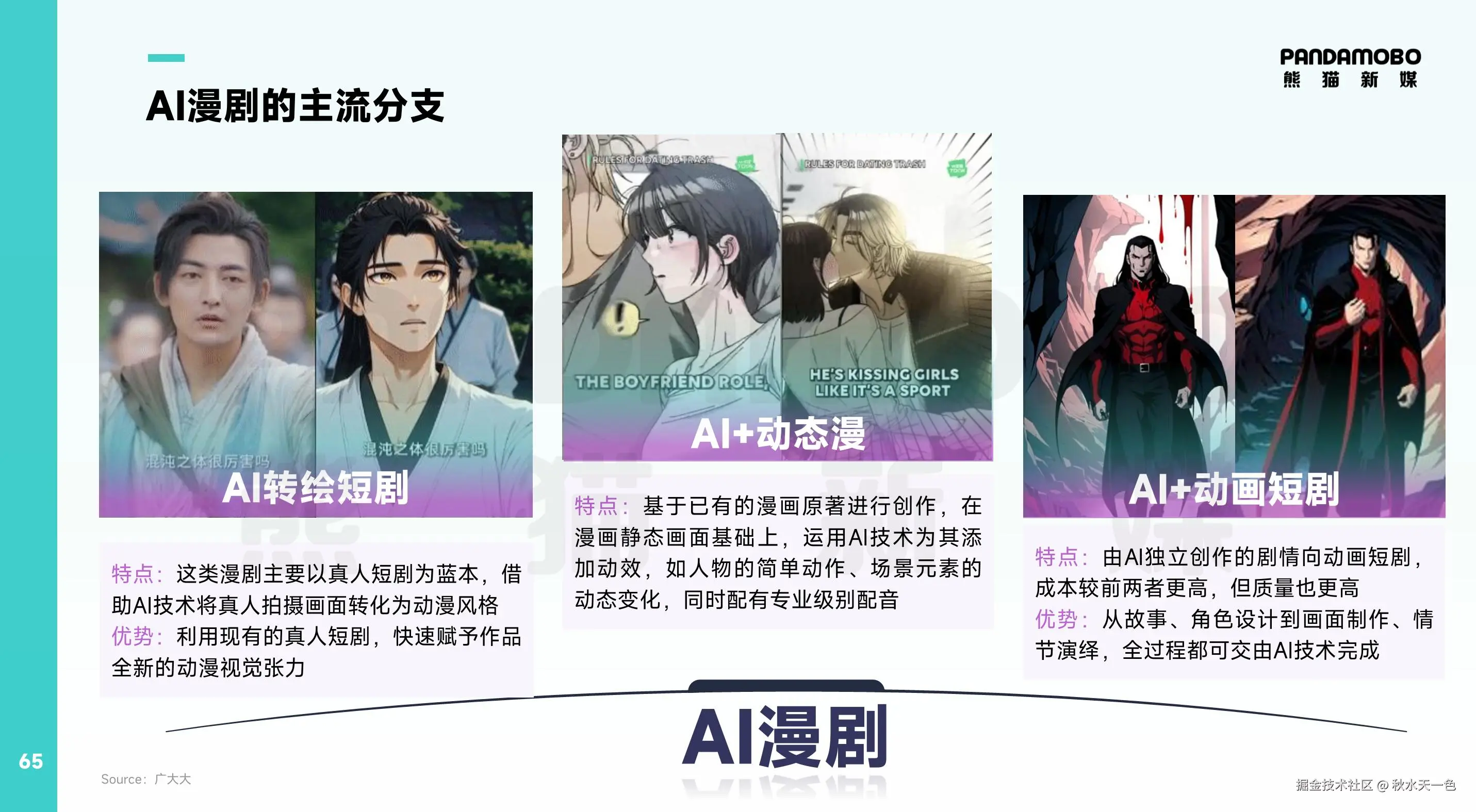 AI漫剧并不是传统意义上的动画,而是介于漫画、短剧、动态视觉叙事的一种新的内容形态,其类型除了我们上面说到的AI转绘短剧外,还有AI+动态漫、AI+动画短剧等多种形态。