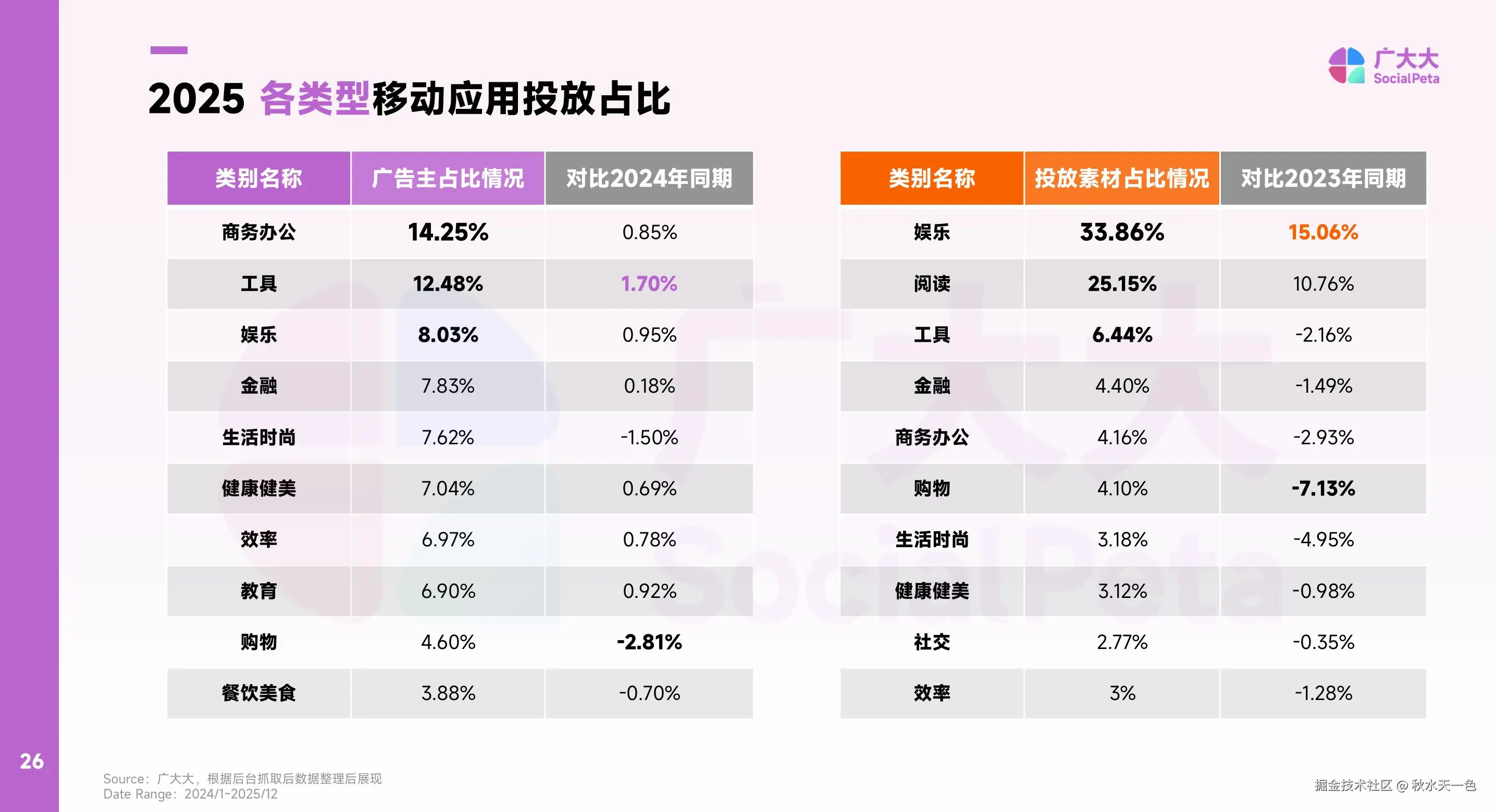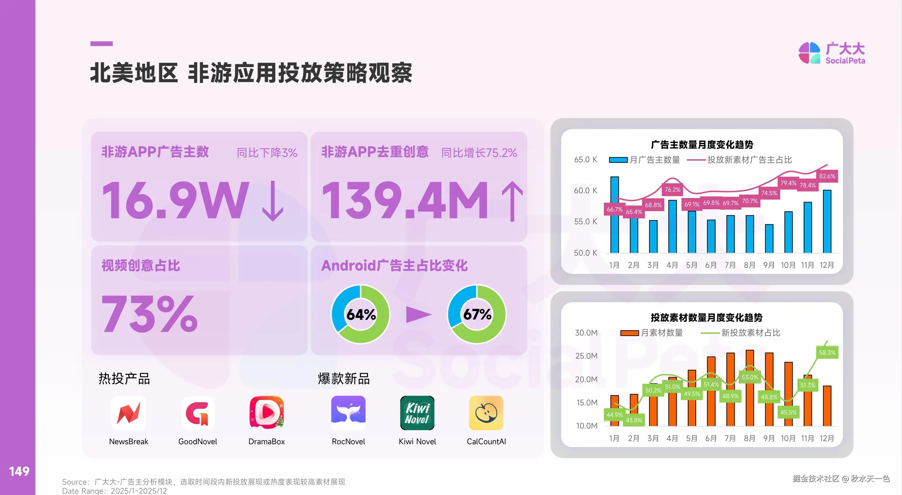 从品类结构看,商务办公、工具、娱乐、金融依然是广告主占比最高的几大类;从素材量角度,娱乐(短剧)、阅读、AI相关应用占据了绝对主导地位。