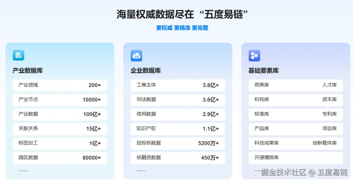 高质量的数据是API服务价值的根基。五度易链依托多年数据积累与治理经验,构建了覆盖广、质量高、更新快的企业信息数据库。