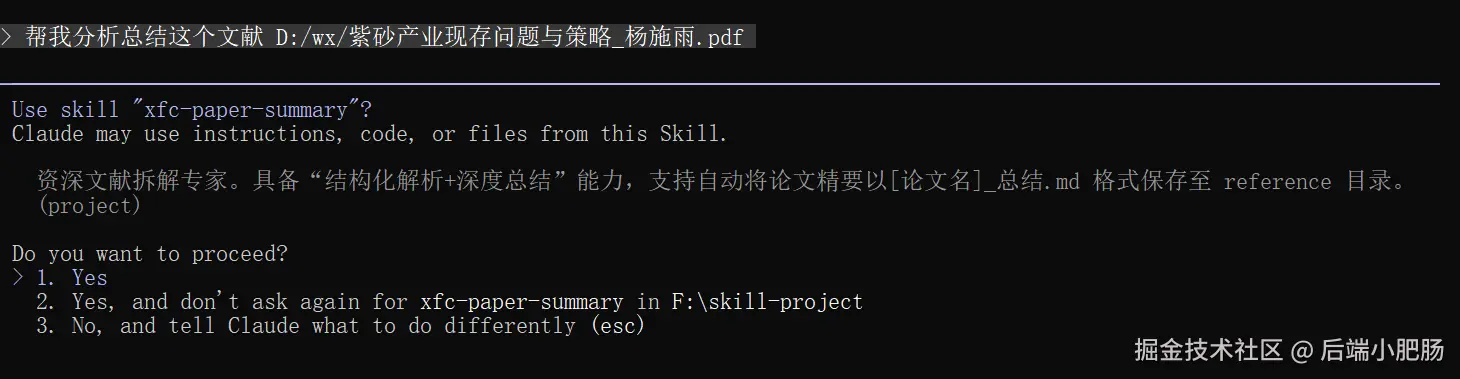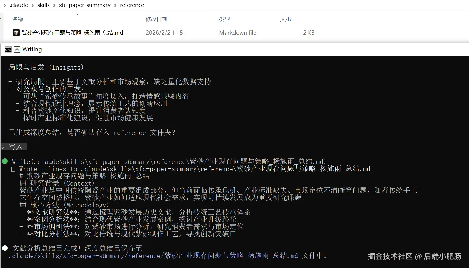 可以看到claude code自主调用了skill并完成了文献的拆解和总结