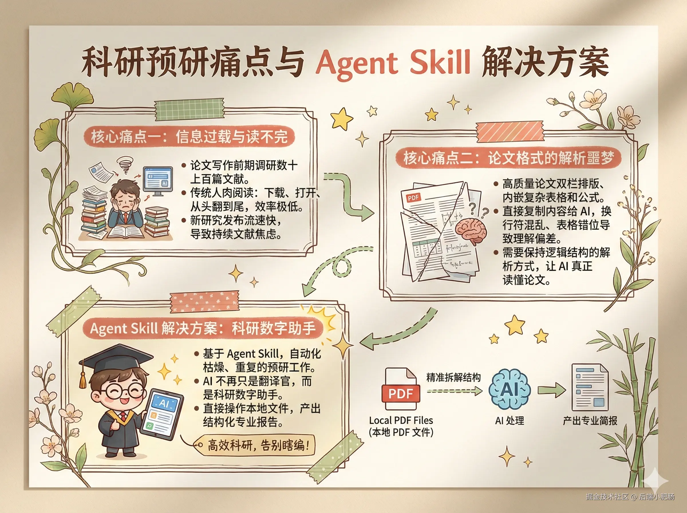 从上图可以看出我们面临的主要是信息过载与论文格式难以解析的两大痛点。基于 Agent Skill,我们可以将这些枯燥、重复、高出错率的预研工作完全自动化。AI 不再只是个翻译官,而是变成了一个能直接操作本地文件、精准拆解结构并产出专业简报的科研数字助手。