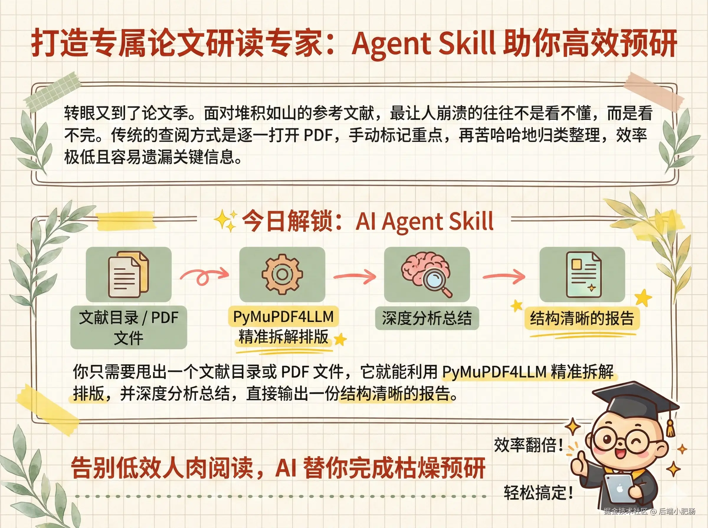 本文我们将开发一个 Agent Skill,利用 PyMuPDF4LLM 精准拆解 PDF 论文后调用 AI 深度分析总结。你只需提供文件,它便能自动输出结构化报告,告别低效的人肉阅读,让 AI 替你完成最枯燥的预研工作。