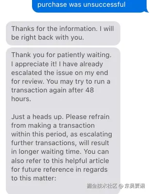 "The issue has been escalated and in 48 hours you can try again to purchase."