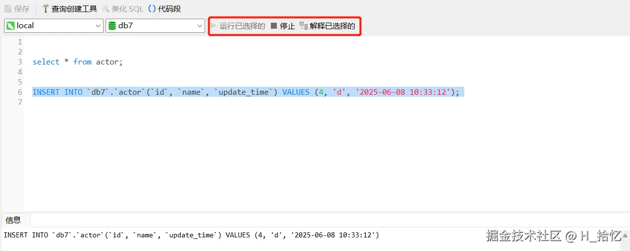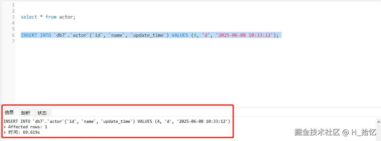 INSERT INTO `db7`.`actor`(`id`, `name`, `update_time`) VALUES (1, 'a', '2025-06-08 10:33:12');
