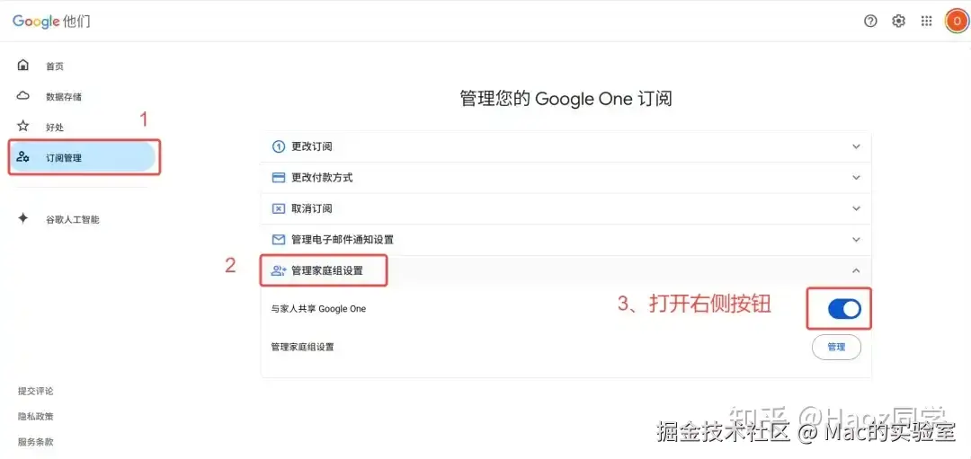 点击订阅管理,点击管理家庭组设置打开与家人共享Google one权益