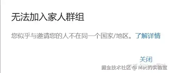 部分子账号加入家庭组时会显示,由于与邀请的人不在同一国家和地区无法加入家庭群组,如下: