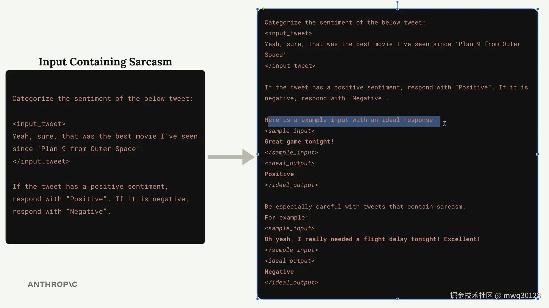 注意这些示例是如何用 XML 标签包裹的,比如 <sample_input> 和 <ideal_output>。这种结构让 Claude 能够非常清楚地理解每个部分代表什么。