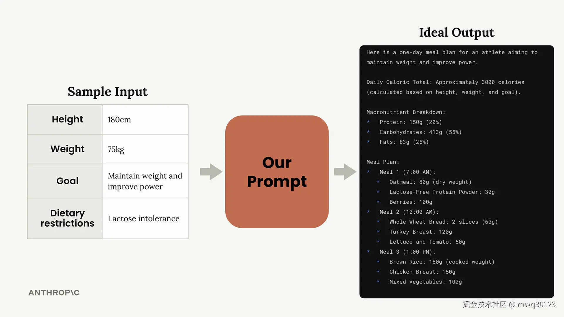 为了演示这个过程,我们将通过一个实际案例来进行:创建一个为运动员生成单日膳食计划的提示词。该提示词需要考虑运动员的身高、体重、目标和饮食限制,然后生成一份全面的膳食计划。