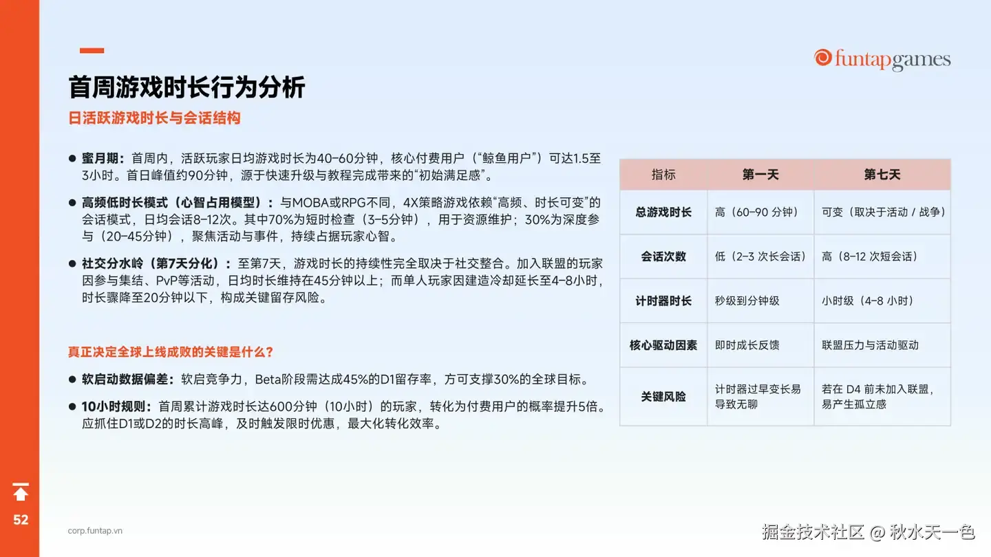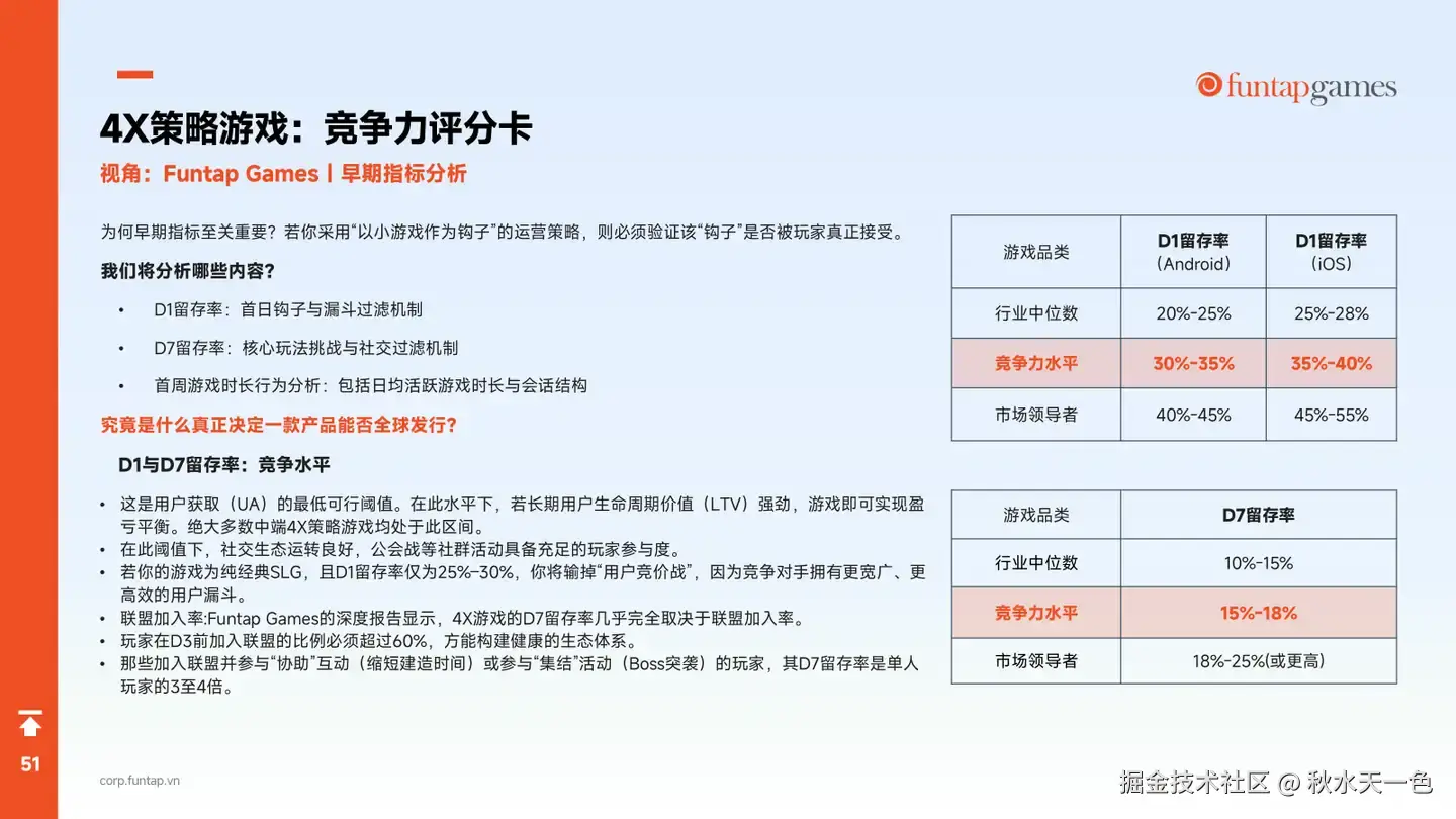 在本次白皮书中东南亚头部发行商Funtap Games结合他们的发行经验给出了策略产品海外发行的重要数据指标:4X策略游戏的早期指标是验证产品全球发行潜力的关键。竞争力阈值要求D1留存率需达30%-35%(iOS端35%-40%) ,D7留存率需超15%-18%。若D1留存率低于25%,产品将在用户竞价中处于劣势。