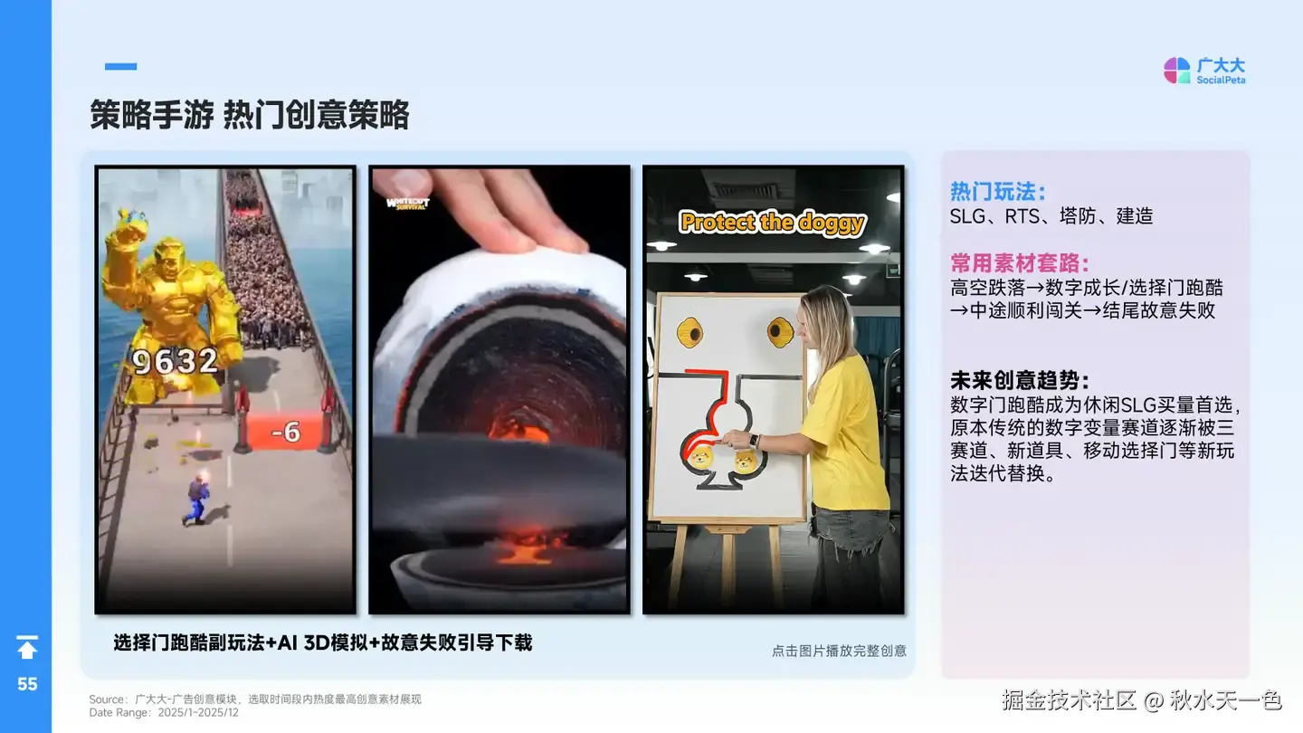 策略手游创意持续迭代,AI生成内容成为效率杠杆。头部素材普遍采用“AI角色抢镜→玩法展示→情感共鸣”结构,例如结合微恐剧情或家庭冲突增强代入感。未来趋势指向更深度的玩法融合,如SLG整合休闲小游戏元素,以及通过文化适配(如武侠题材)切入细分市场。