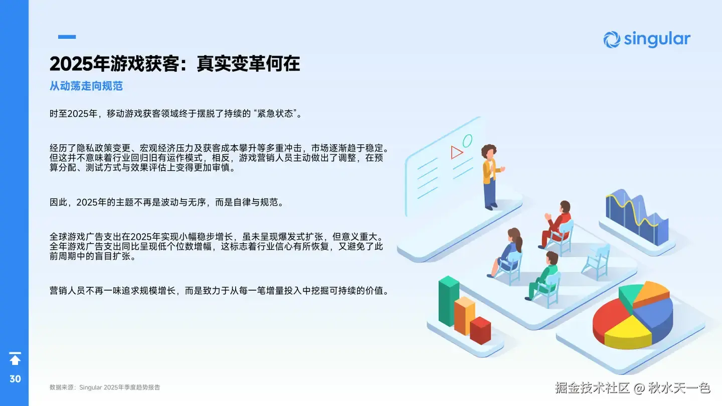 2025年,移动游戏获客领域终于摆脱持续的“紧急状态”,进入自律与规范的新阶段。根据Singular数据显示,全球游戏广告支出实现低个位数稳步增长,营销人员不再盲目追求规模,而是致力于从每一笔增量投入中挖掘可持续价值。