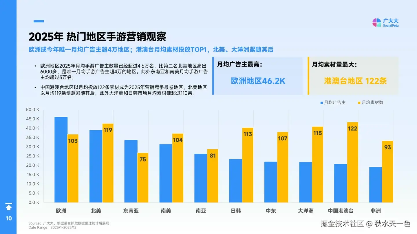 地区方面,欧洲以月均4.6万名广告主成为最活跃市场,港澳台地区则以月均122条素材量成为“最卷”区域,北美、大洋洲紧随其后。系统偏好上,Android端广告主占比接近80%,但中重度产品在iOS端的素材占比超32%,反映高价值用户更集中于iOS平台。
