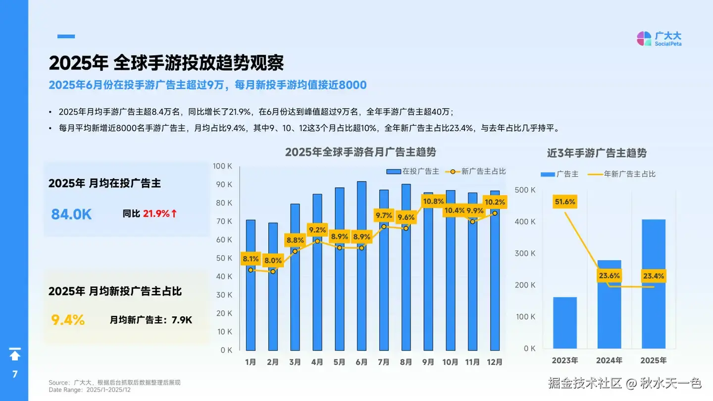 2025年,全球手游市场迎来结构性变革。大盘数据显示,全球月均手游广告主数量突破8.4万名,同比增长21.9%,6月峰值时超过9万名。全年新投广告主占比达23.4%,市场活跃度持续攀升。