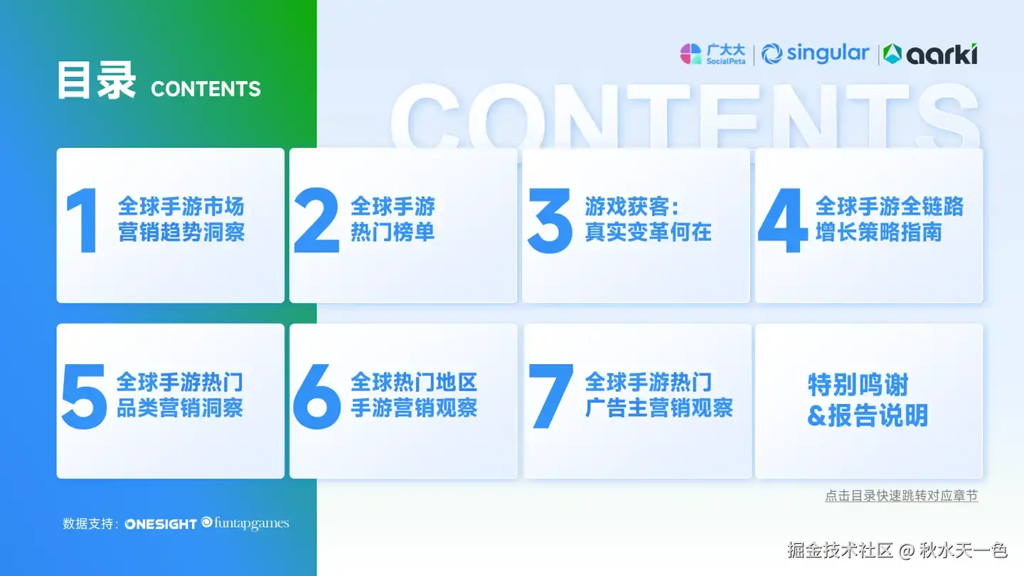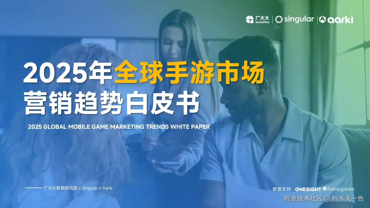 当全球手游市场从流量红利转向存量博弈,2025年的营销战场早已硝烟弥漫。本次广大大联合Singular、Aarki重磅发布《2025年全球手游市场营销趋势白皮书》 ,携手Funtap Games、OneSight提供核心数据支撑,更汇聚益世界、英雄游戏、游戏葡萄、GameLook等众多行业大咖独家观点,为手游从业者奉上一份兼具数据洞察与实战指南的年度力作!