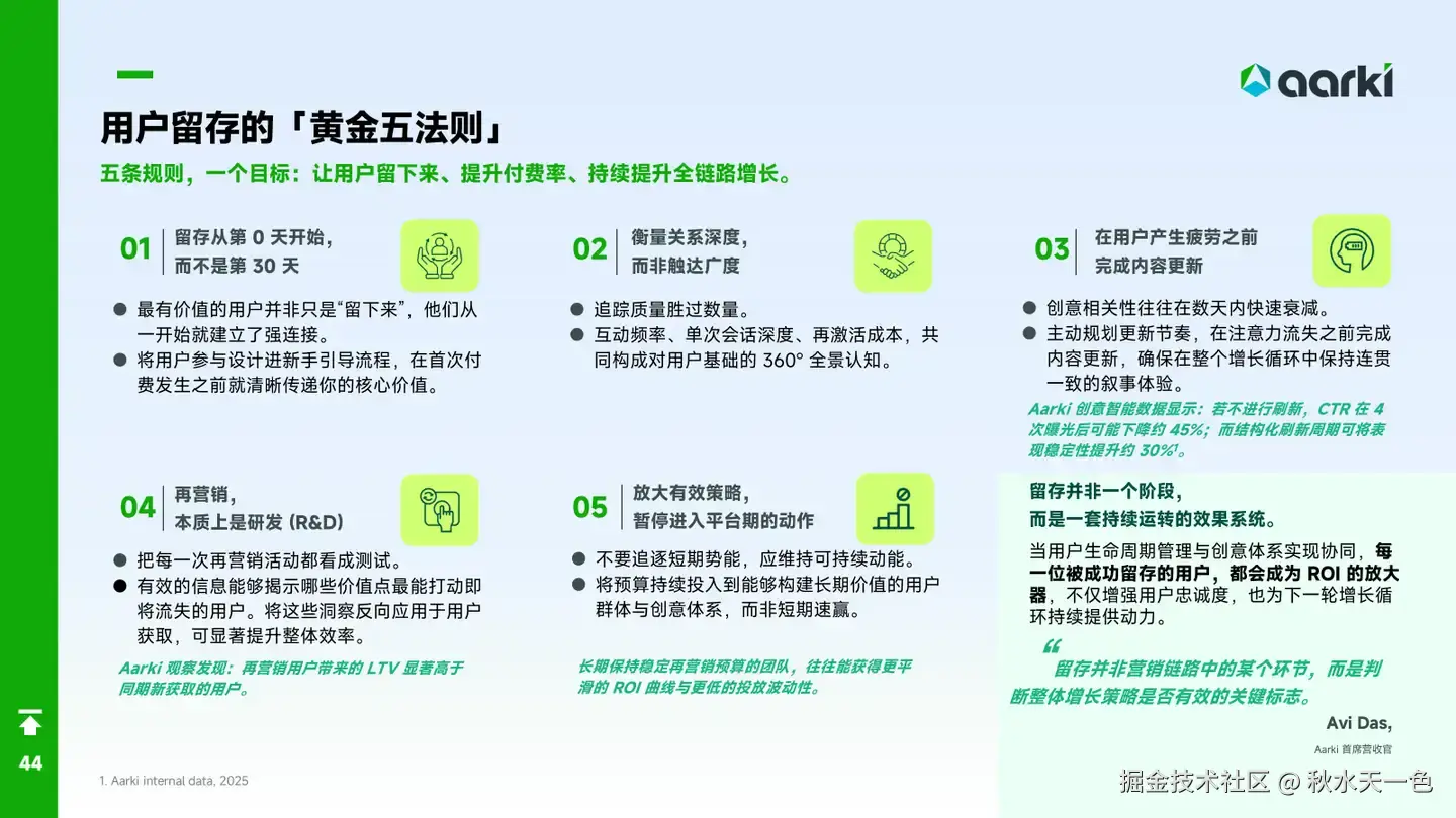 Aarki指出,未来竞争优势在于将数据信号转化为决策闭环,构建“用户滋养”而非“流量消耗”的生态。营销者需掌握投放节奏:当留存表现优异时扩量;当CPI增速超过LTV时暂停并重新评估;对新洞察及时再投入。