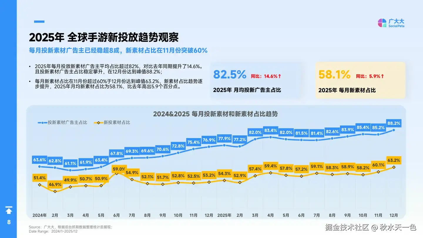 素材迭代成为竞争核心:每月投放新素材的广告主平均占比82.5%,同比提升14.6%;新素材占比在12月达到峰值63.2%,视频类创意以74.1%的占比主导市场,其中30秒以下短创意占58%,凸显“轻量化”内容趋势。