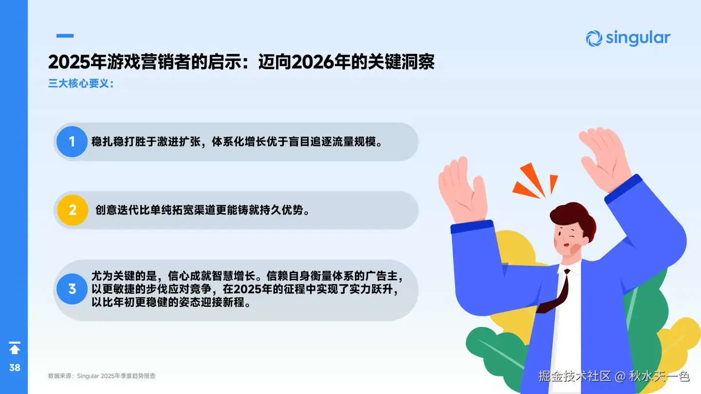 衡量体系构建竞争优势: 采用多触点归因的广告主能更清晰洞察渠道协同价值,而通过模型化转化填补iOS信号缺失,成为头部企业加速决策的关键。Singular强调,2026年的竞争在于将数据信号转化为决策闭环,构建可持续的增长体系。