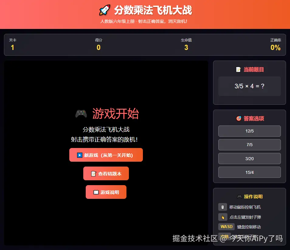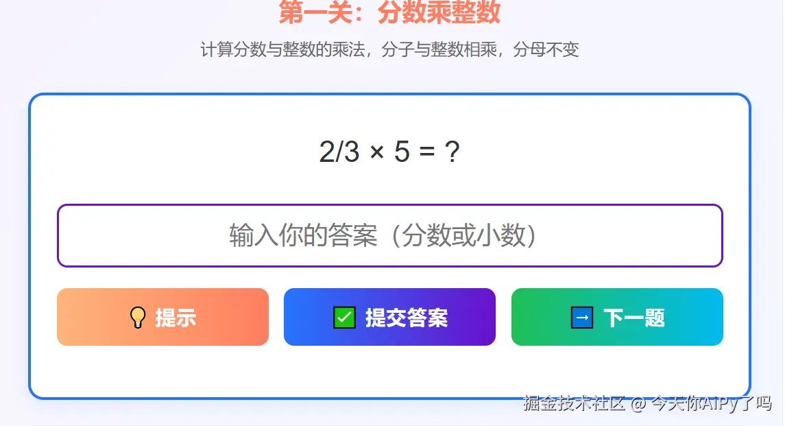 直接通过与AiPy对话:将”分数乘法“这部分的知识点做成一个小游戏,以便学生学习