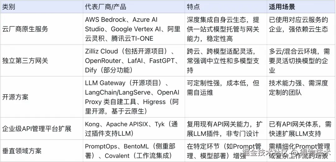 目前市场上有多种大模型网关解决方案,它们在商业模式和核心能力上都各有特色。这里笔者将各类网关产品进行了梳理与汇总,以便读者大致了解行业现状。
