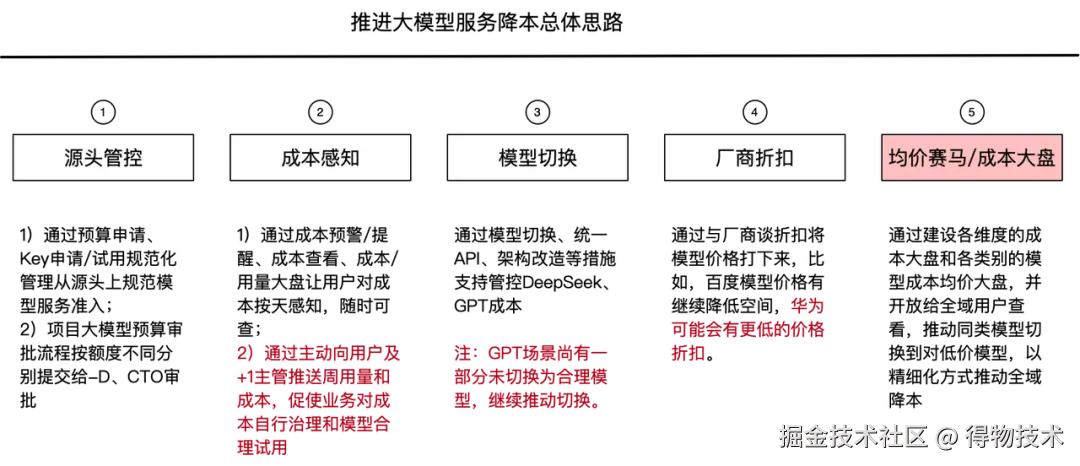 目前正在搭建精细化降本能力,其核心思路是:通过构建Key/模型/厂商/项目维度的成本大盘、构建各外部厂商各类别模型均价大盘(发现更有性价比的模型)、建设用量和成本每周主动推送机制、完善成本预警/告警体系等措施,促使业务依据成本和价格数据主动进行成本治理。