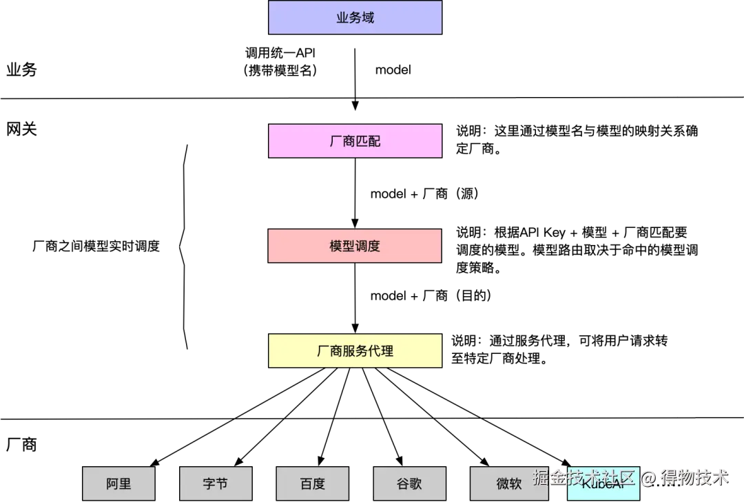 通过建设OpenAI like风格的统一访问API和模型服务调度能力,网关将绝大部分AI模型服务的访问集中到单一入口,使不同业务线无需关注后端模型的具体实现细节,也能实现不同厂商模型服务之间的容灾。
