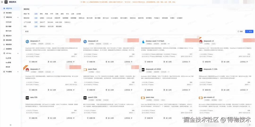 为此,网关对接入模型进行统一梳理,打造信息完备的“模型市场”。本质上是一个“AI 模型应用商店”,将分散混乱、高门槛的选型流程,重构为集中、透明、可量化评估的标准化路径。