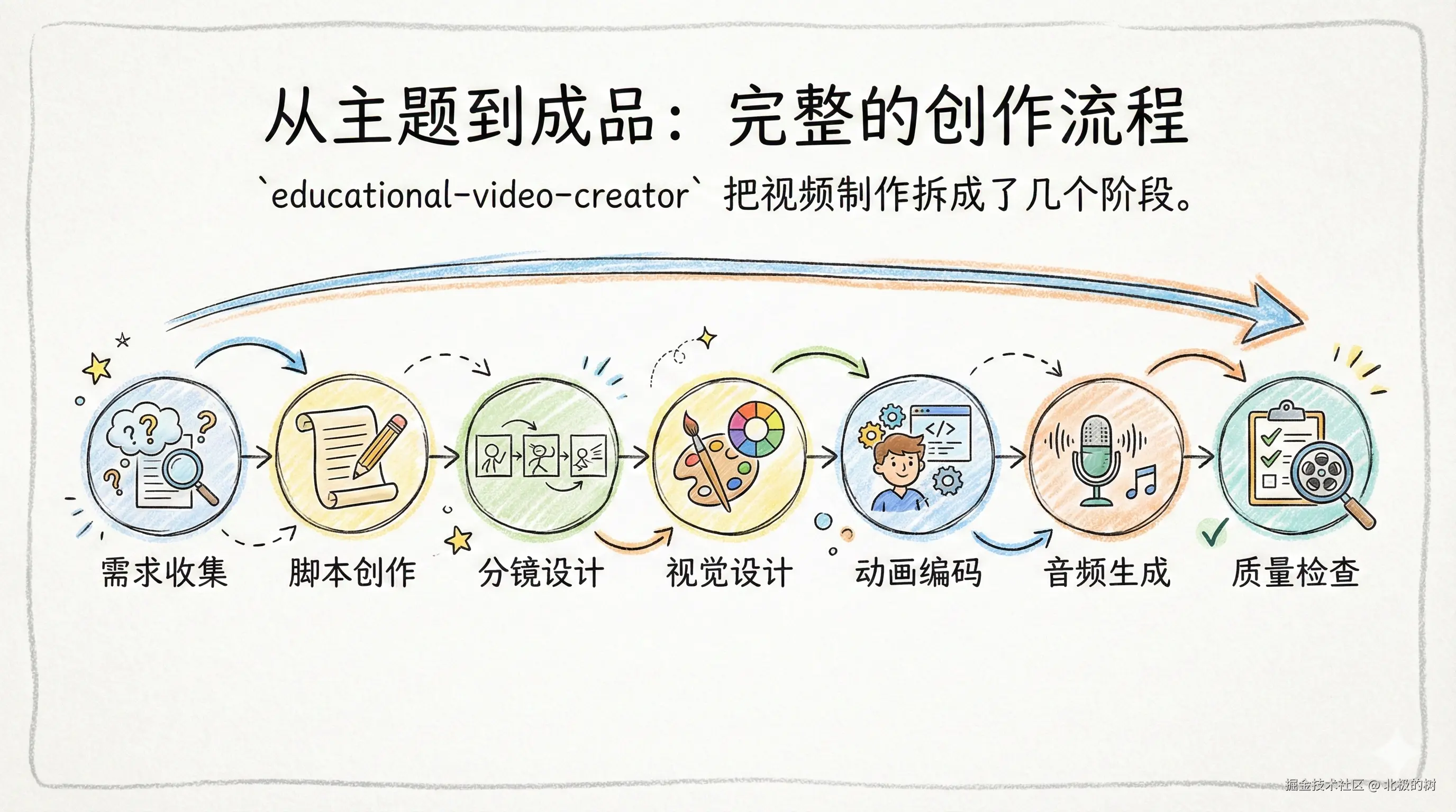 这个 Skill 不是简单地把文字转成视频。它会自动写脚本、设计分镜、画动画、生成配音,还会自动检查质量。说白了,就是把一个专业视频团队的工作流程,用AI跑了一遍。