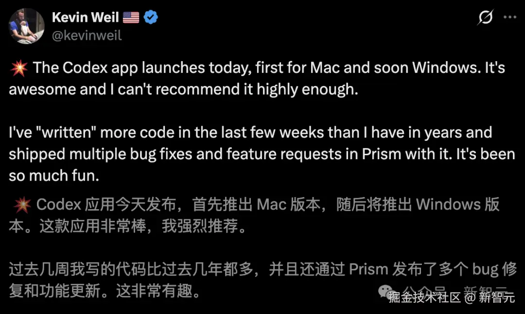 OpenAI 科学家感慨,过去几周写的代码比过去几年还要多。而且,还用 Codex 修复了 Prism 多个 bug 和功能更新