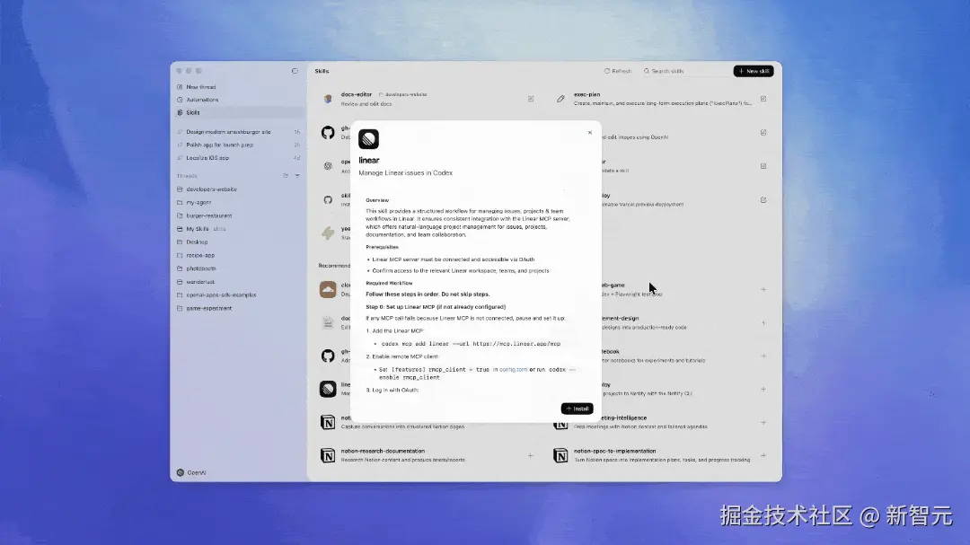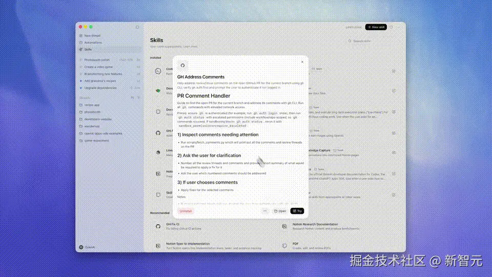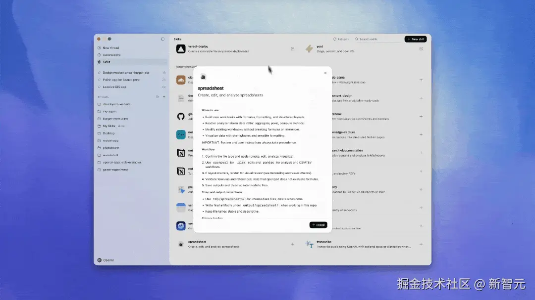 Codex 应用内置了一个 Skills 库,涵盖了 OpenAI 内部流行的工具和工作流,下面重点介绍几个。