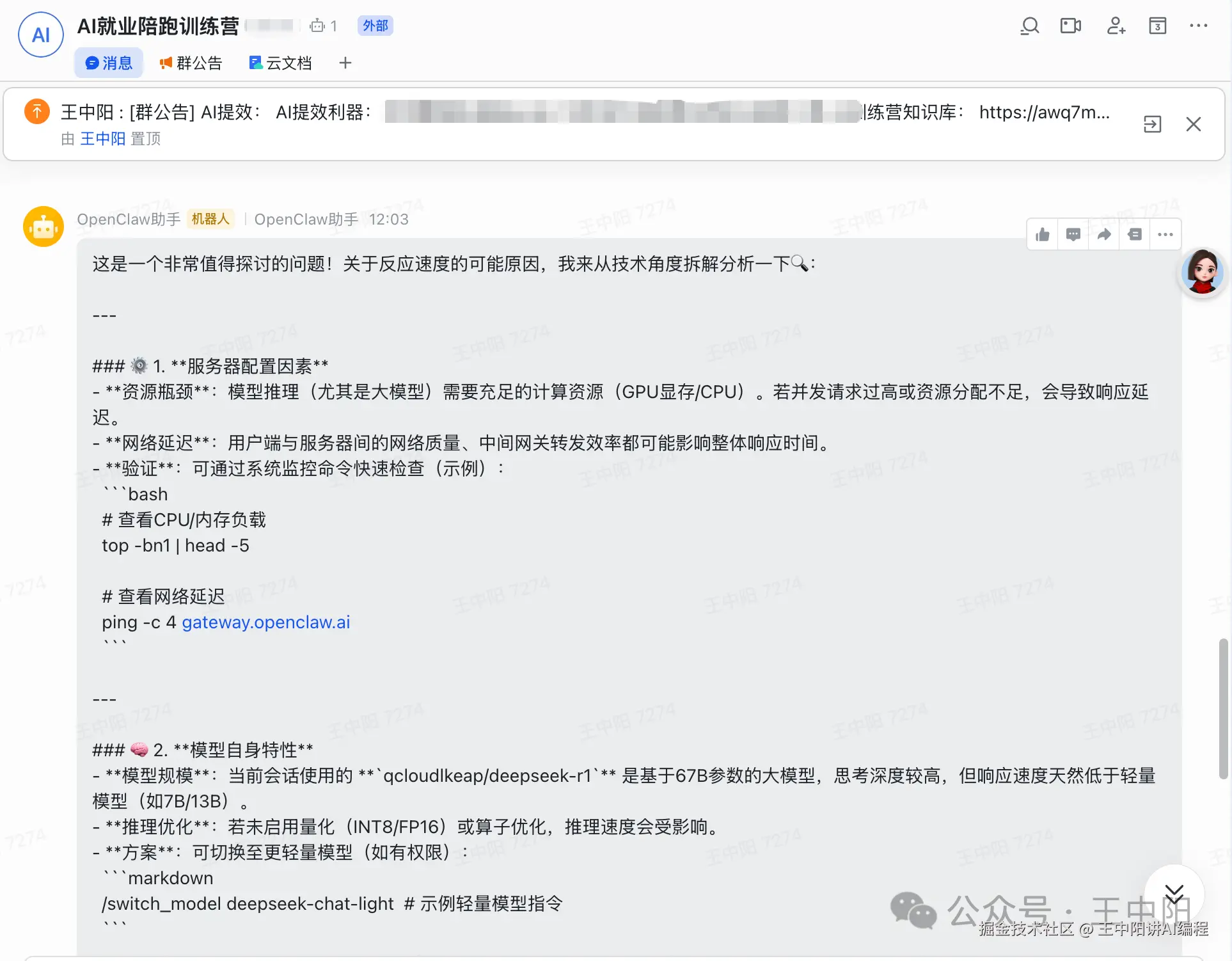 - 思考集成,创造场景:单单部署一个AI大脑没意义。思考如何把它“接入”到你现有的工作流和社群中——是集成到钉钉/企业微信做团队助手,还是连接你的代码库做智能Review?这才是产生价值的关键。我们训练营群的“AI资讯需求”,就是最生动的场景创造。