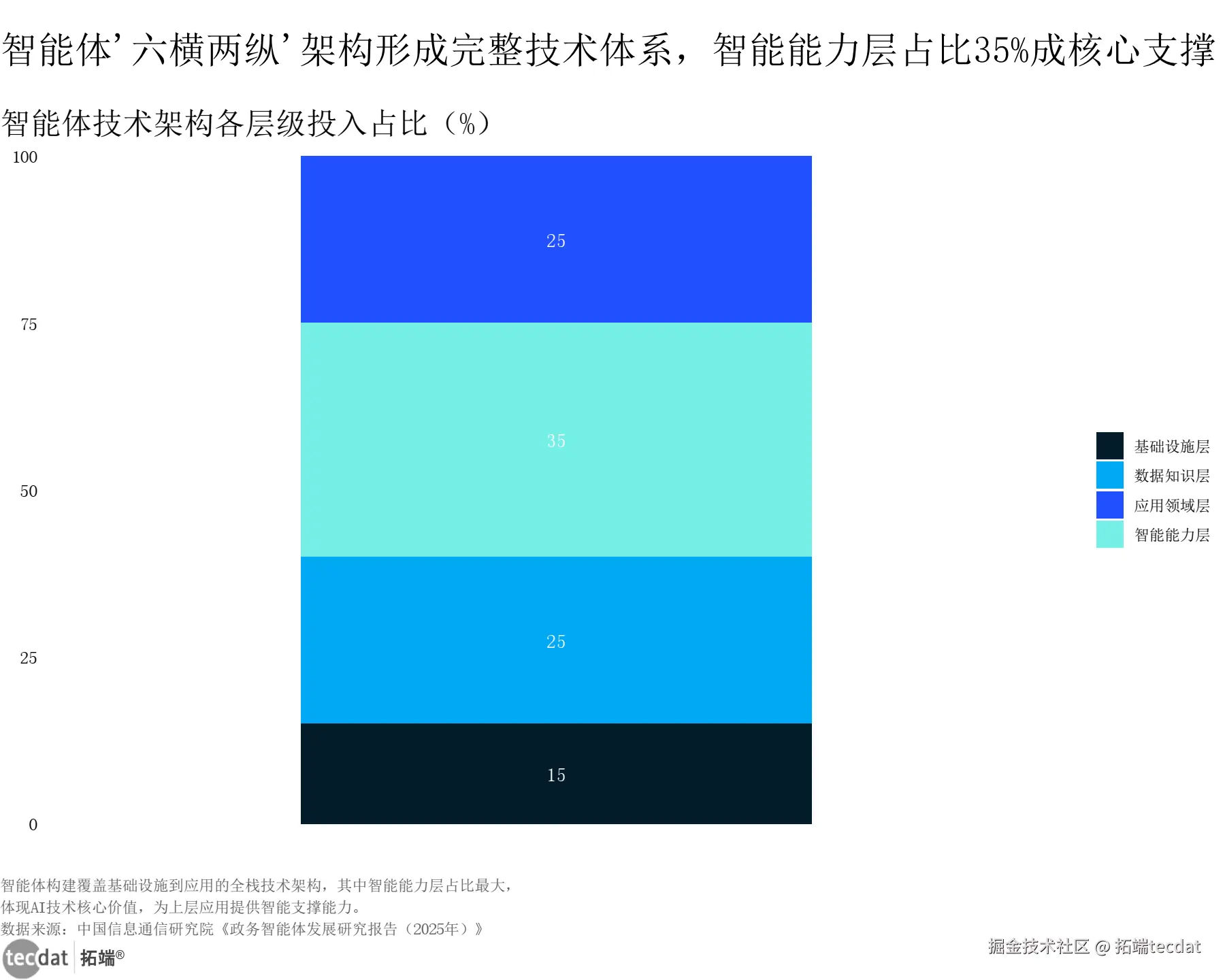 行动建议:技术研发团队可优先投入智能能力层与数据知识层,提升模型推理与数据治理能力,构建核心技术壁垒;企业决策者可按此比例规划技术预算,避免基础设施过度投入,平衡成本与效能;初创企业可聚焦智能能力层的细分技术模块,打造差异化竞争力。